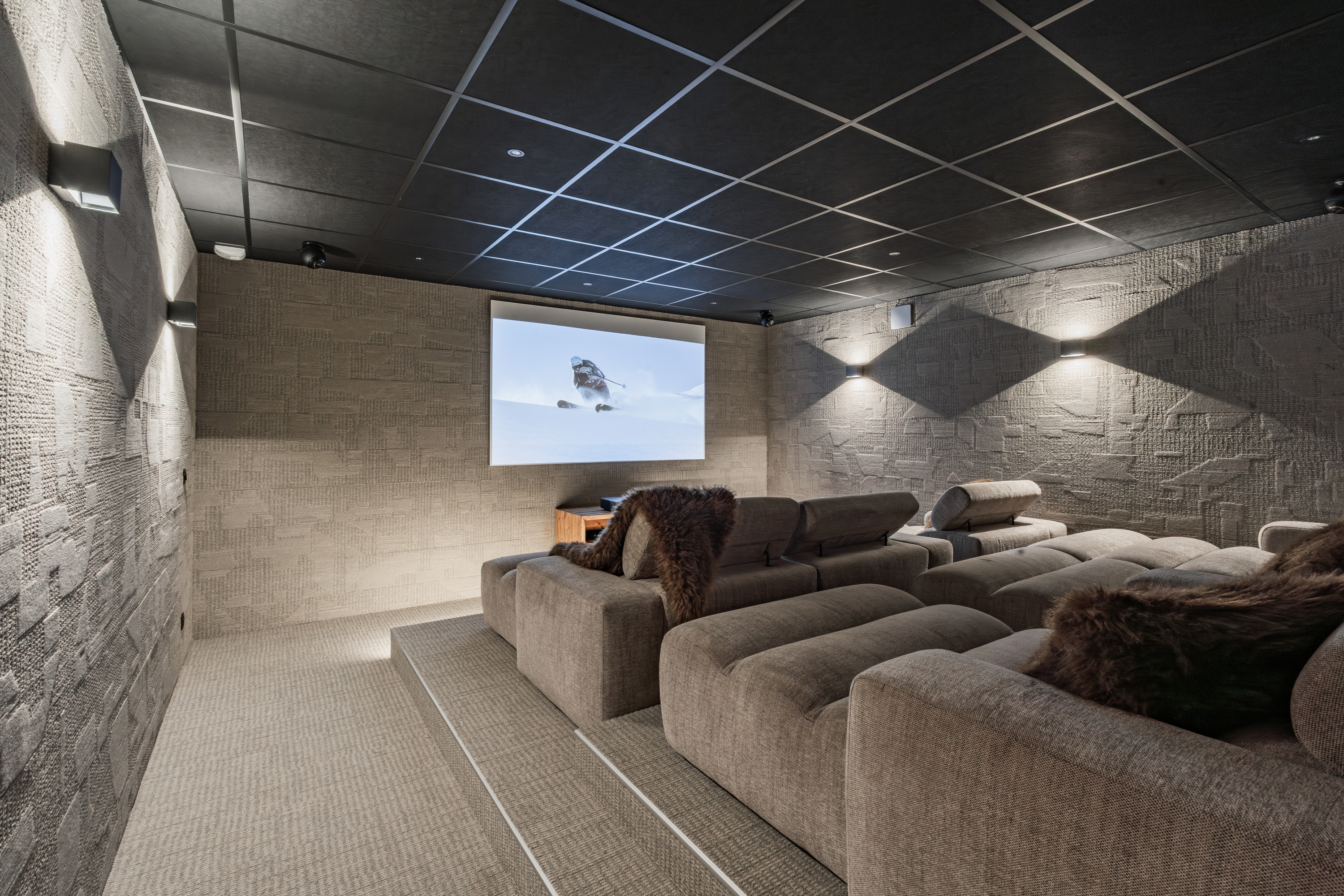 Le niveau inférieur accueille également une salle home cinéma, permettant de prolonger les soirées dans un cadre confortable et convivial.